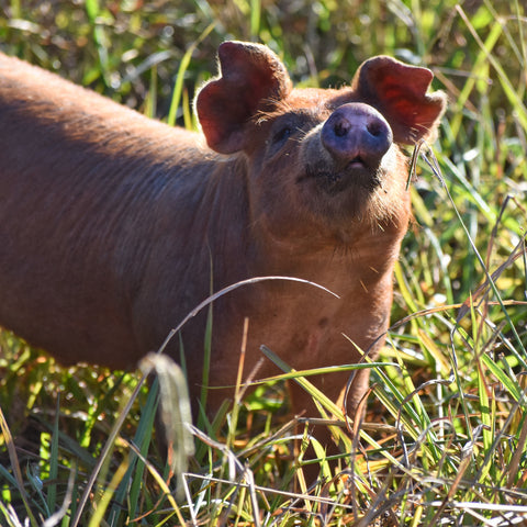 Our pigs live their lives on pasture, never confined, free to forage and root amongst the eucalypt trees as instinct dictates. Every single week they are moved to fresh pasture giving them constant access to fresh grass and undisturbed soil. This not only means healthier and happier pigs, it embraces our commitment to regenerating the landscape.